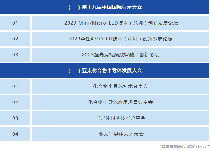 新(xin)型顯(xian)示展(zhan)同期論壇更注重與高(gao)交會(hui)新(xin)型顯(xian)示展(zhan)在展(zhan)區內容規(gui)劃(hua)方向的融合,加強“展(zhan)+會(hui)”結合,深化“展(zhan)”、“會(hui)”互(hu)動(dong),營造更緊(jin)密(mi)的“展(zhan)”、“會(hui)”全線體(ti)驗(yan)。本屆展(zhan)會(hui)同期論壇圍繞顯(xian)示和半導(dao)(dao)體(ti)兩大版塊,論壇聚焦Mini/Micro-LED、柔性AMOLED、超高(gao)清視頻(pin)、化合物半導(dao)(dao)體(ti)等多個(ge)行業熱(re)點主題,跟蹤前沿技術,探(tan)索產(chan)業未(wei)來。