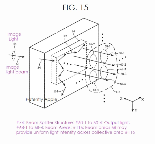 蘋果專(zhuan)利圖 15 是一個透視圖,顯示了波導如何(he)在(zai)兩個維度上(shang)向眼盒填充光線。