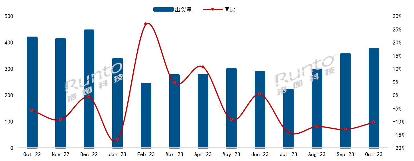 根據洛圖科技(RUNTO)發布的《中國電視市場品牌出貨月度快報(China TV Market Brand Shipment Monthly Express)》數據顯示,2023年10月,中國電視市場出貨總量達到374萬臺,環比9月繼續上漲5.4%,但同比去年下降達10.3%。