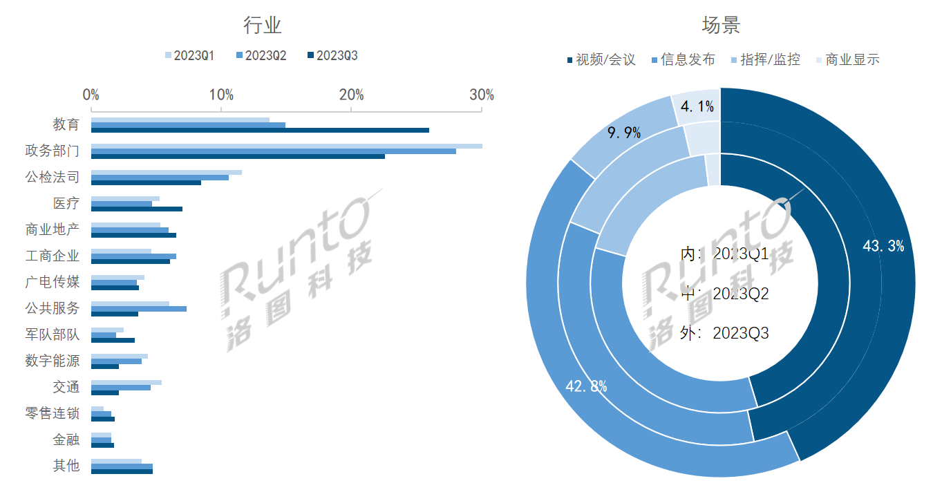 根據洛圖科技(RUNTO)調研數據,2023年第三季度,小間距LED顯示屏在教育行業出貨面積居首,市占26%。政務部門和公檢法司分別占比22.6%、8.5%,合并占比31.1%。醫療和軍隊的需求增速相對較快,與第二季度相比增長1倍。