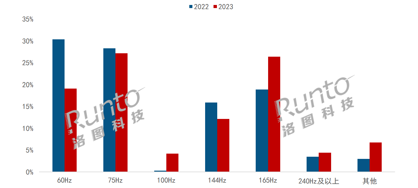 根據洛圖科技(RUNTO)線上監測數據顯示,165Hz(含170Hz超頻)的市場份額約占26%,同比增長了8個百分點。QHD的市場份額約為32%,同比增長了3個百分點。這兩者的增量主要受益于電競市場的結構升級。