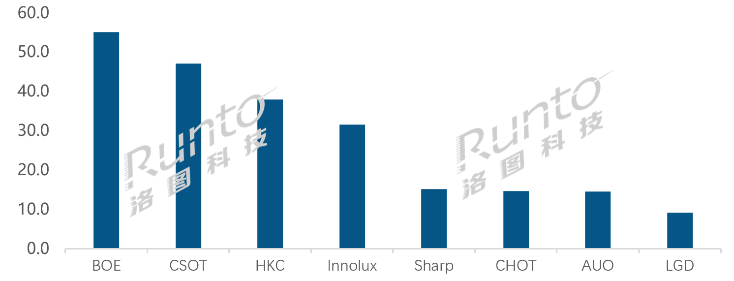 全行業唯一的頭部(年出貨5000萬片以上)廠商是BOE(京東方),全年出貨約5520萬片,同比下降11.6%,市場份額為24.4%,同比下降0.3個百分點。
