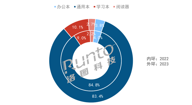 更具體地來看下細分應用場景的市場表現,洛圖科技(RUNTO)將智能平板分為四大類:智能閱讀器、學習平板(又稱學習本)、辦公平板(又稱辦公本)和通用本。