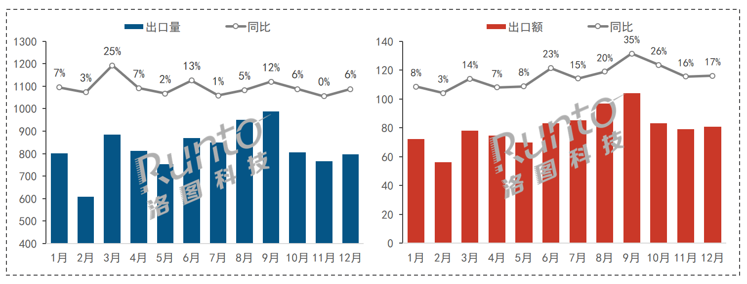根據洛圖科技(RUNTO)數據顯示,電視機出口量為9963萬臺,同比增長7.5%,出口額為983億元,同比增長16.3%。其中,液晶電視的出口量占整體市場99%的份額,為9887萬臺,同比增長7.5%;出口額為964億元,同比增長16.7%,出口均價975元,同比增長8.6%;按美元計,出口額為137億美元,同比增長10.3%。