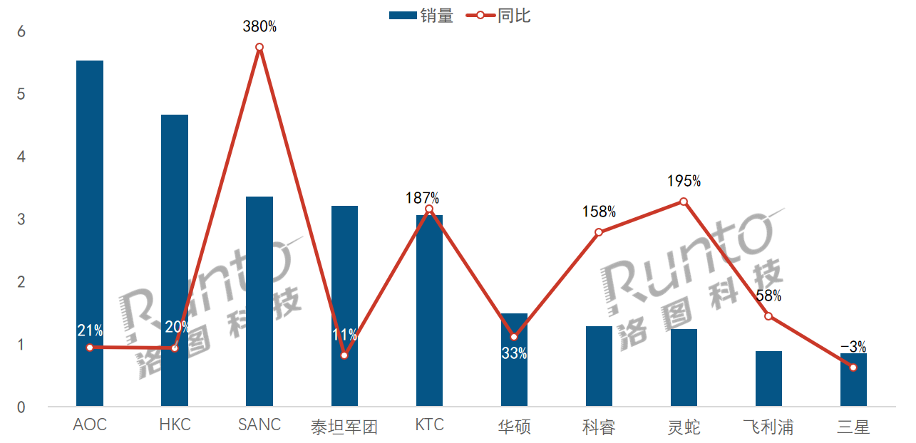 當月表現和前月相比,AOC、HKC、SANC的前三位置保持不變,泰坦軍團超越了KTC,科睿上升了兩個名次,飛利浦擠進前十,而LG則在此次排名中跌出前十。Top10中前九名均實現了同比上漲。