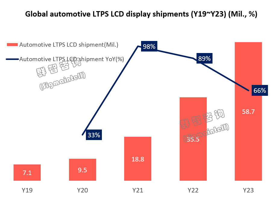 LTPS LCD車載顯示面板出貨量達到約5870萬片,同比增長66%,占車載顯示出貨總量的28%。