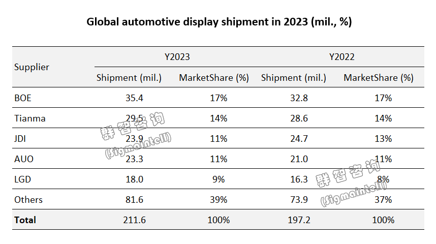日本顯示在2023年仍面臨著財務壓力和市場挑戰,但其依然依靠前期的合作關系和技術底蘊,在車載顯示面板領域保持了一定份額。全年出貨量大約為2390萬片車載顯示面板,同比下滑3%,導致全球車載顯示市場份額減至11%。盡管持續的財務困境限制了新的業務拓展和訂單增長,但日本顯示希望通過不斷調整戰略、增加合作渠道,開發新產品以及優化服務來應對市場變化,力求未來在車載顯示領域仍保持一定行業地位。