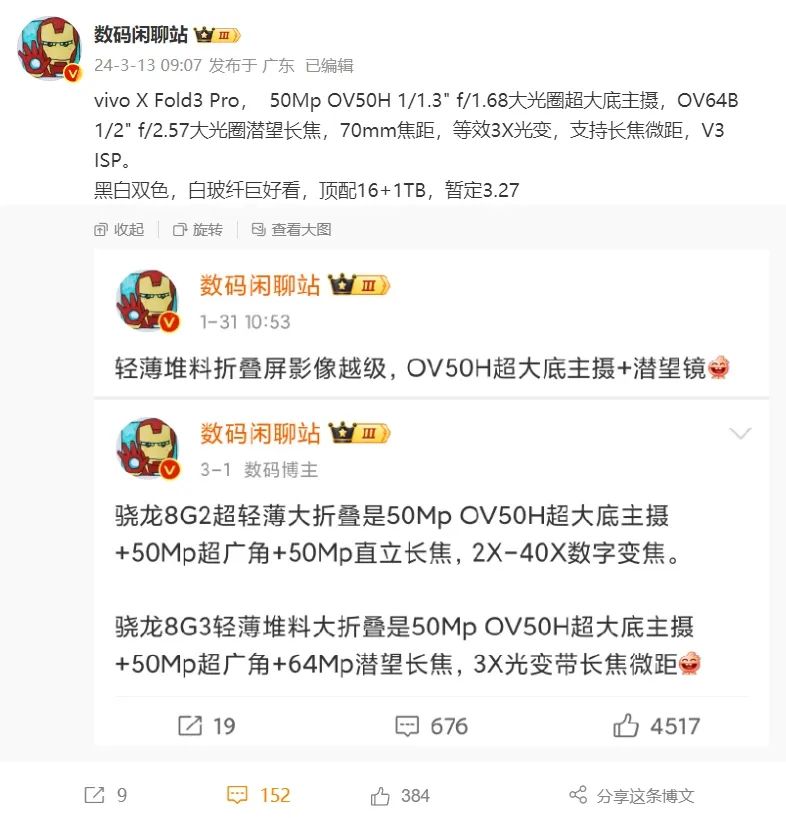 3 月 13 日消息,@數碼閑聊站 爆料稱,vivo X Fold 3 Pro 暫定 3 月 27 日發布,提供黑白雙色,其中白色版本采用玻璃纖維材質,最高 16+1TB 存儲。
