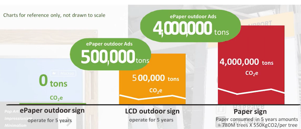 E Ink元太科技公司曾經以32英寸的紙質廣告、液晶屏幕和電子紙顯示屏對戶外數字標牌的碳排放影響為例進行了比較測算。如果有10萬個電子紙廣告牌每天運行20小時,每小時更新廣告20次,并持續5年,與液晶屏相比,使用電子紙屏將減少約50萬噸CO2排放量。與只使用一次即丟棄的傳統紙質海報相比,使用電子紙屏可將CO2排放量減少約400萬噸。