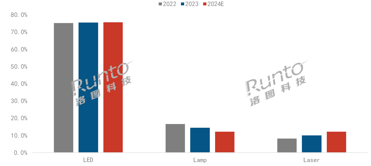 LED燈仍是市場主流的光源類型。根據洛圖科技(RUNTO)數據顯示,2023年,LED燈在全球投影市場的出貨量占比為75.4%,與2022年基本持平。