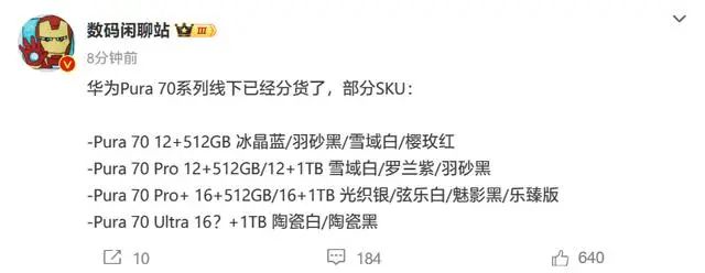 博(bo)主 @數(shu)碼閑聊站 剛(gang)(gang)剛(gang)(gang)也發文稱,華為 Pura 70 系列線下已經發貨了,并列出了部分 SKU: