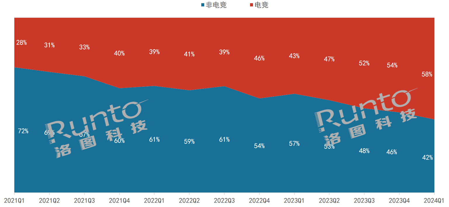 在之前發布的《2024年第一季度中國顯示器線上市場季度報告》一文中提到,電競顯示器在當季占到了獨立顯示器整體線上市場的58%,滲透率創季度歷史新高。三年以來,電競在整體市場的占比剛好翻了一番。
