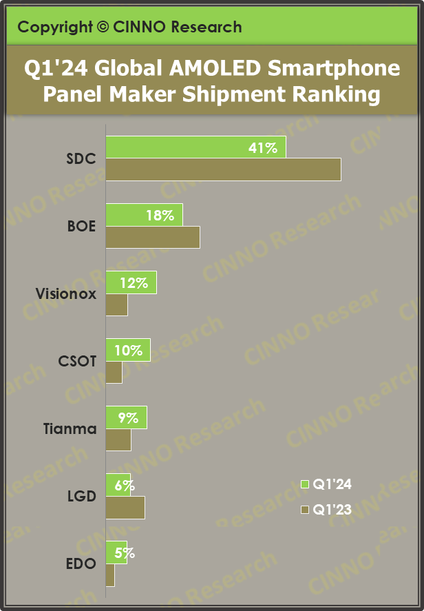 根據CINNO Research統計數據顯示,2024年第一季度全球AMOLED智能手機面板出貨量約1.9億片,同比增長44.6%,環比下滑18.8%。