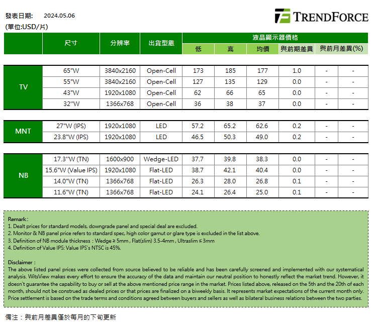 范博毓說,筆電(NB)用面板第2季需求相較第1季的淡季開始明顯上揚,但是增加幅度仍低于原先預期,也反映品牌客戶對未來終端需求的不確定性仍高,因此較難出現明確的面板價格上漲訊號。面板廠也因需求增長幅度不如預期,導致對于面板價格策略也不易出現強勢且一致的默契。目前預期5月的NB面板價格,僅HD TN機型面板因供給有限,需求較好,且價格偏低,有機會微幅上漲0.1美元。FHD IPS機型的供給廠商多,競爭較激烈,部分面板廠希望可以跟進HD TN機型價格,也同步上漲0.1美元,但仍需觀察品牌客戶的態度而定。