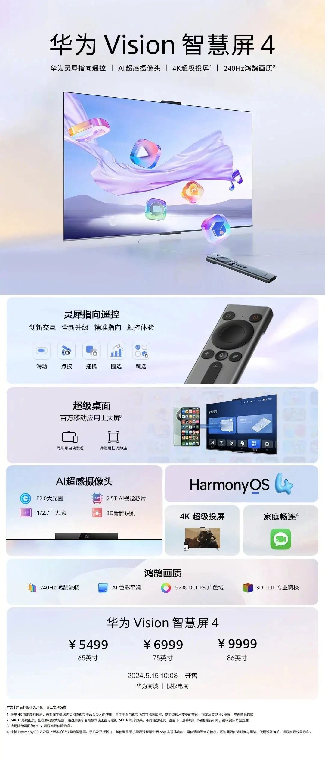 華為(wei) Vision 智慧屏 4 提供 65、75、86 英寸三種尺寸,售價分別為(wei) 5499 元(yuan)、6999 元(yuan)、9999 元(yuan),預(yu)售到手價分別為(wei) 4999 元(yuan)、6499 元(yuan)、8999 元(yuan)。