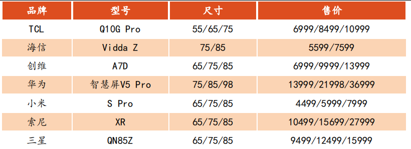 Mini-LED背光TV到達價格甜蜜點,預計滲透將加速。目前,大部分品牌的Mini-LED背光電視價格普遍降價至1萬元以下,雖然仍為普通LCD電視價格兩倍以上,但是已經進入普通消費者可接受的價格范圍。Mini-LED電視相比LCD可以獲得更佳使用體驗,而OLED電視價格普遍還在2萬元以上,如果消費者需要選擇一款高端電視,則Mini-LED會成為消費者的首選。