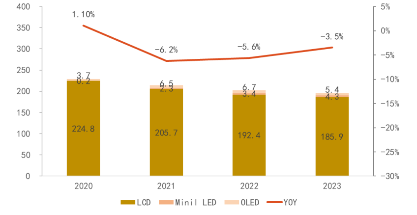 全球TV出貨量下降,Mini-LED逆勢增長。根據奧維睿沃統計,2023年全球TV出貨量為1.96億臺,同比下降3.5%,OLED電視出貨量540萬臺,下降了19.4%。根據洛圖科數據,Mini-LED電視2023年出貨量為430萬臺,同比增加24.6%,預計2024年Mini-LED電視出貨量將反超OLED電視。在電視市場小幅萎縮的情況下,Mini-LED電視實現逆勢大幅增長,尤其是在中高端滲透較快,預計會成為TV廠商重點競爭領域。