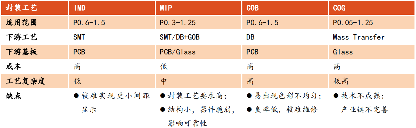 多種技術路徑探索Mini-LED顯示封裝技術,未來將長期共存。傳統小間距可以采用SMD貼片式LED,但隨著間距的縮小面臨很多缺陷,進而催生了IMD、MIP、COB和COG等技術路徑。但是各個新技術路徑各自存在劣勢,目前沒有完全勝出的技術,各個廠商也選擇壓注不同路徑,我們預計各自技術未來還將長期共存: