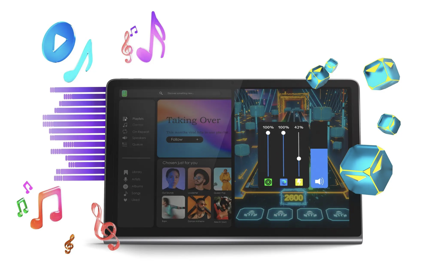 據介紹,這款(kuan)平(ping)板(ban)(ban)電腦配備 11.5 英寸 2000x1200 分辨率 90Hz 屏幕(mu),內置八個(ge) JBL 揚聲(sheng)器(qi)和一個(ge)集成(cheng)支架,號稱擁有(you)高達 175 度(du)的“觀看靈活性”,用戶也可以將(jiang)自己的手機配對到這款(kuan)平(ping)板(ban)(ban)電腦外放(fang)音(yin)樂,從而讓平(ping)板(ban)(ban)變身(shen)“藍牙音(yin)箱”。