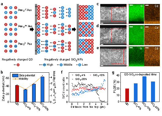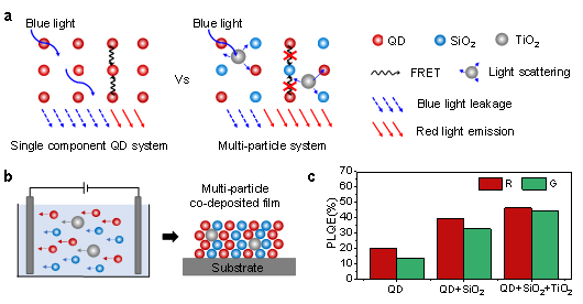 研究人員選用二(er)氧化硅(SiO2)和(he)二(er)氧化鈦(TiO2)納(na)米(mi)粒(li)(li)子(zi)與量(liang)子(zi)點(dian)(QD)集成(cheng),協同納(na)米(mi)粒(li)(li)子(zi)的間隔作用和(he)散(san)射效(xiao)應,以解決單(dan)一組(zu)分QD膜中由(you)于共(gong)振能(neng)量(liang)轉移(FRET)引起的發光效(xiao)率(lv)(lv)下降問題。通過精(jing)細的表面設計,研究人員利用EPD技術實現了QD、SiO2和(he)TiO2納(na)米(mi)粒(li)(li)子(zi)的精(jing)確共(gong)沉積,提(ti)高了QD薄膜的發光效(xiao)率(lv)(lv)(圖1)。