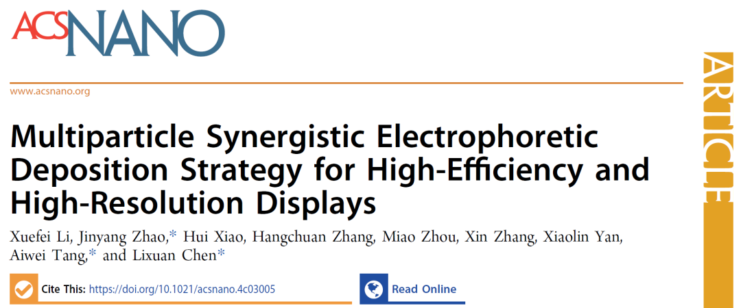 鑒于(yu)(yu)此,近(jin)日(ri),TCL華(hua)星趙金(jin)陽(yang)博(bo)士,陳黎暄博(bo)士研究團(tuan)隊(dui)聯合(he)北京交通(tong)大學唐愛偉教授提出(chu)了(le)(le)一種多粒子(zi)協同電泳沉積策略(lve),實現(xian)了(le)(le)可(ke)控組裝,高效率(lv)(lv)和(he)高分辨(bian)率(lv)(lv)的顯示(shi)圖案。相關成果以“Multiparticle Synergistic Electrophoretic Deposition Strategy for High-Efficiency and High-Resolution Displays”為題,發表(biao)于(yu)(yu)國際著名期(qi)刊(kan)《ACS Nano》。