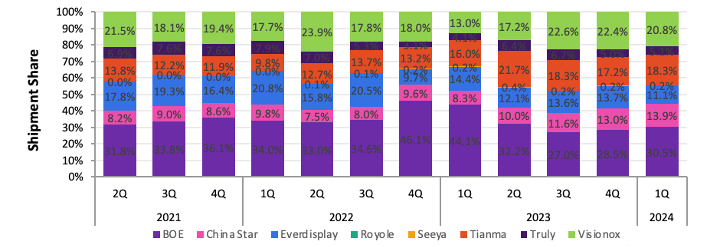 2024年第一季度,京東方占據中國OLED出貨量(包括中國面板制造商的OEM單元出貨量)的最大份額(30.5%),其次是維信諾(20.8%),天馬(18.3%),華星光電(13.9%),和輝光電(11.1%)和信利(5.1%)
