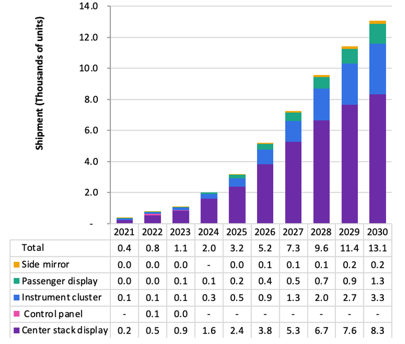 如下所示。OLED顯示器用于后視鏡、乘客顯示屏、儀表盤和其他車輛應用,但OLED面板的高成本限制了其使用,到2023年,OLED顯示器僅占車輛總面板的 0.6%。
