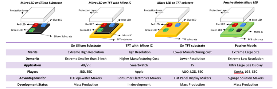 蘋果研究了多種可選配置,最終選擇了帶有Micro IC 的TFT MicroLED。這種方法采用了數字驅動機制,將 EQE 提高了 20% 至 30%,克服了不使用 Micro IC 而使用模擬驅動時 EQE 較低的問題。Micro IC 方法的缺點是成本比 TFT 基板上的 MicroLED 更高。