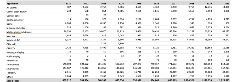 2021-2030年AMOLED出貨量預測(按應用劃分)(來源:Omdia)