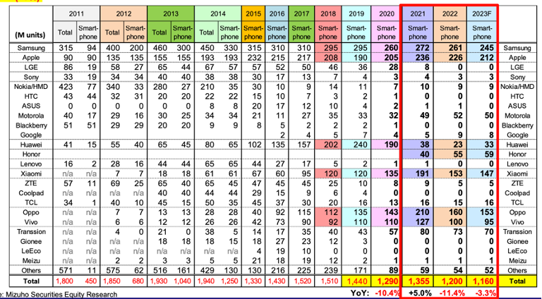 2011年至2023年智能手機出貨量(按OEM劃分)(來源:瑞穗證券)