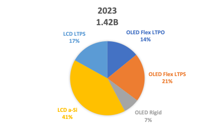 下圖顯示了2023年面板出貨量按技術劃分的對比情況,其中最大的變化是從LCD面板轉向OLED面板。雖然面板產量保持不變,但OLED份額從42%上升至63%,主要轉變是從LCD LTPS轉向OLED柔性LTPO。