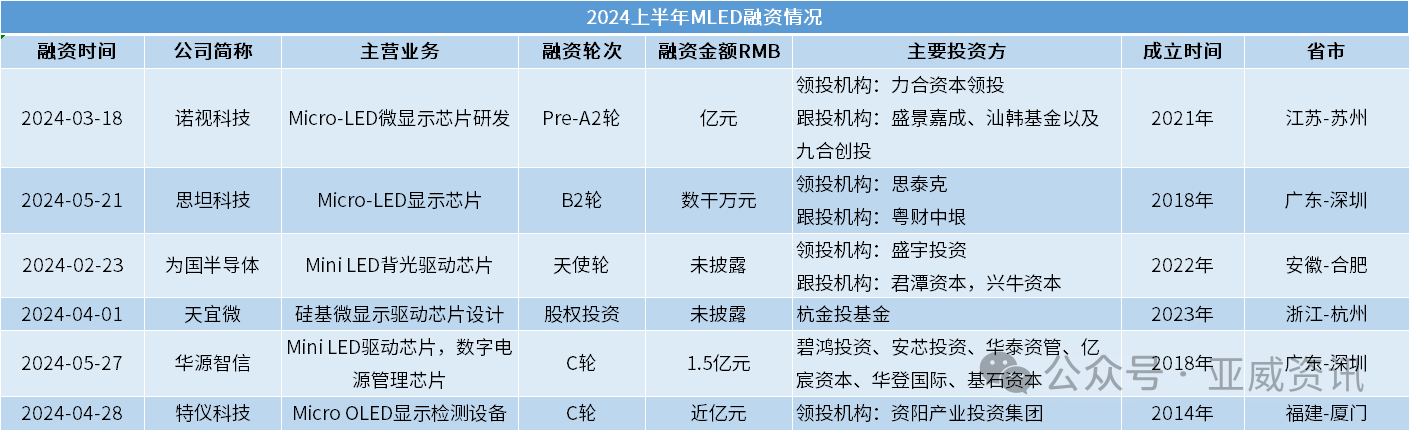 2024年上半年,據不完全統計,我國MLED相關融資項目集中在Micro LED芯片和MiniLED驅動芯片方面,其中諾視科技和華源智信融資金額在億元左右。另外Micro LED顯示檢測設備供應商特儀科技獲得近億元融資。