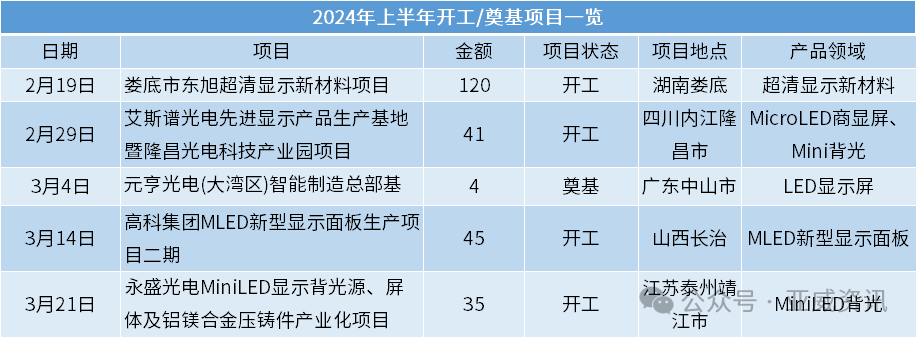 開工項目共5個,投資金額為245億元,其中婁底東旭光電超高清顯示新材料項目總投資120億元,其他為Mini LED背光項目或MIcro LED顯示屏項目。