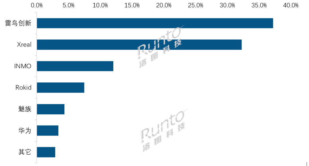 根據洛圖科技(RUNTO)線上監測數據,2024 年上半年中國 AR 設備線上市場品牌銷量份額方面,雷鳥創新、XREAL、INMO 和 Rokid 位列前四,合計銷量份額達到 89.2%。腰部品牌中,星紀魅族和華為異軍突起,搶占了 8% 左右的份額,競爭逐漸激烈,同時拉低了市場集中度。