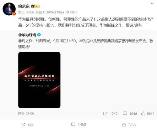 昨日華為官方宣布,華為品牌盛典及鴻蒙智行新品發布會將于9月10日舉行,屆時將發布全新的智能手機產品。