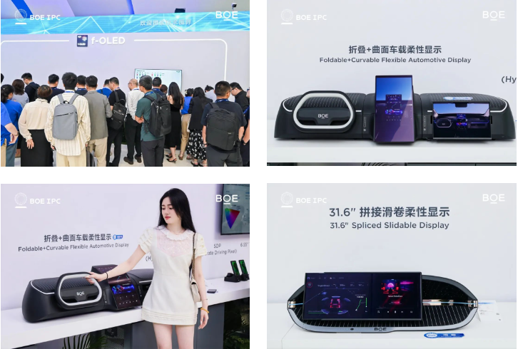 f-OLED展區內,京東方31.6英寸拼接滑卷柔性顯示產品可實現31.6英寸32:9、24.6英寸24:9、17.6英寸18:9三種尺寸四種顯示狀態,可根據不同場景需求實現形態切換;另一款電動卷曲柔性顯示產品具有5倍拓展顯示面積、4mm最小卷曲半徑,拓寬了柔性OLED的應用場景。