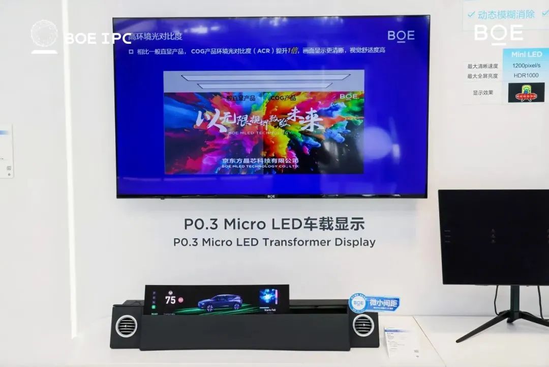 α-MLED展區內,京東方發布了首款P0.3 Micro LED車載顯示產品,實現了曲面無邊框拼接顯示,環境光對比度高達40000:1,峰值亮度超過2000nits,同時擁有高色域高刷新率;
