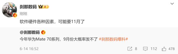 9月12日,有數碼博主表示,今年華為Mate70系列,9月份大概率發不了,由于軟件硬件各種因素,可能要推遲到11月了。雖然其沒有透露具體的原因,但是從其提及的軟硬件兩方面看,新機可能在芯片以及純血鴻蒙的軟件適配上遇到了麻煩。
