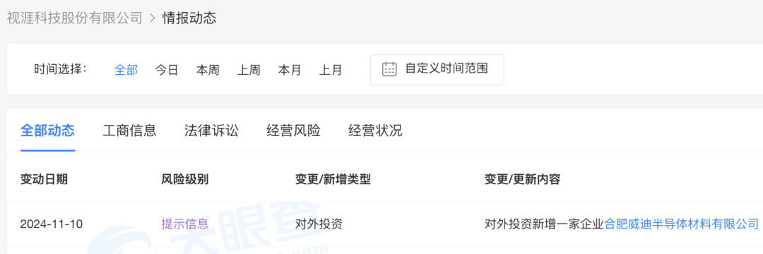 近日,天眼查APP顯示,Micro-OLED廠商視涯科技股份有限公司發生工商變更,對外投資新增一家企業合肥威迪半導體材料有限公司。認繳金額為280萬元,最終受益股份為1.7368%。