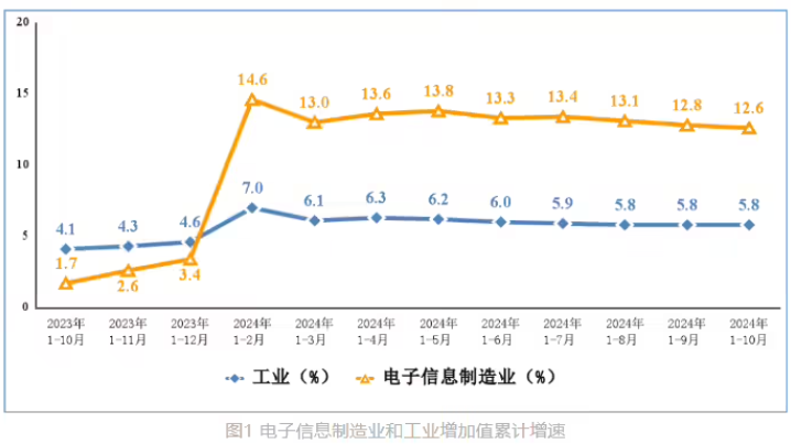 12 月 1 日消息,據“工信微報”消息,2024 年 1—10 月,我國規模以上電子信息制造業增加值同比增長 12.6%,增速分別比同期工業、高技術制造業高 6.8 個和 3.5 個百分點。10 月份,規模以上電子信息制造業增加值同比增長 10.5%。