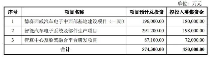 募集說明書(修訂稿)顯示,本次發行的募集資金總額不超過45億元,募資擬投向德賽西威汽車電子中西部基地建設項目(一期)、智能汽車電子系統及部件生產項目以及智算中心及艙駕融合平臺研發項目。