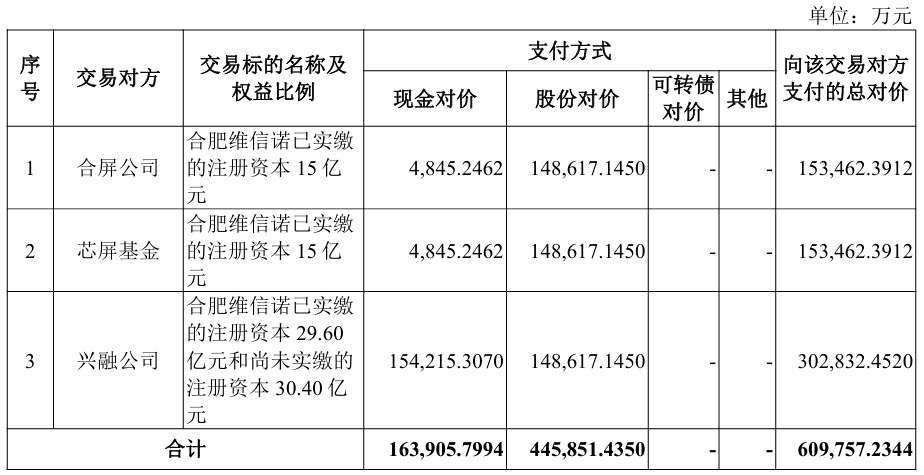 上市(shi)公(gong)(gong)司(si)(si)擬向(xiang)合屏(ping)公(gong)(gong)司(si)(si)、芯(xin)屏(ping)基金(jin)、興融(rong)(rong)公(gong)(gong)司(si)(si)發行股份及支付現金(jin)購買其所持有的(de)合肥(fei)維信諾40.91%股權,前述股權對應合屏(ping)公(gong)(gong)司(si)(si)、芯(xin)屏(ping)基金(jin)、興融(rong)(rong)公(gong)(gong)司(si)(si)已實繳(jiao)的(de)注冊資(zi)本(ben)59.60億(yi)(yi)元(yuan)及興融(rong)(rong)公(gong)(gong)司(si)(si)尚未實繳(jiao)的(de)注冊資(zi)本(ben)30.40億(yi)(yi)元(yuan)。
