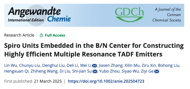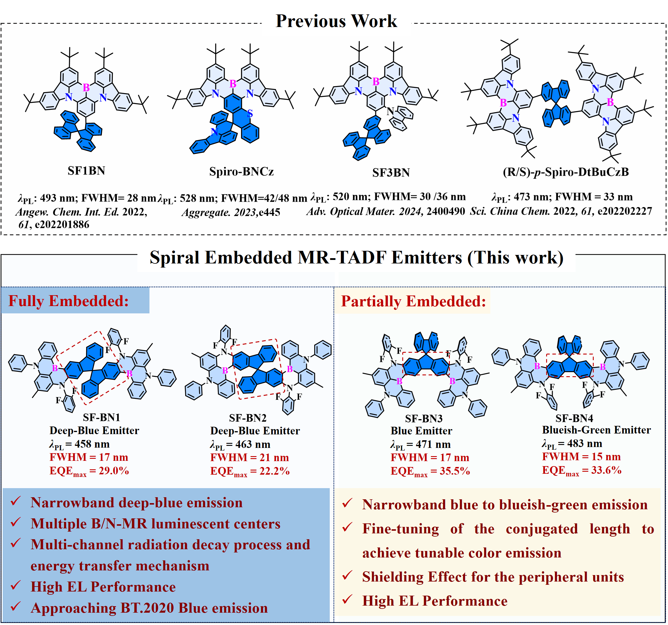 近期,中國科學院寧波材料技術與工程研究所有機光電材料與器件團隊葛子義研究員、李偉副研究員,聯合華南理工大學蘇仕健教授提出一種分子設計策略,將剛性 9,9'-螺雙[芴](SF)單元全部或部分整合到B/N-分子內電荷轉移(MR)發光核心中(圖1),成功開發了含螺芴的MR-TADF材料體系SF-BN1、SF-BN2、SF-BN3 和 SF-BN4,它們具有高色純度和高效率的特性。對于完全嵌入 B/N-MR 核心的發光體SF-BN1和SF-BN2,SF中的sp3雜化碳(tan)原子將(jiang)每個(ge)(ge)分(fen)子分(fen)成對稱的(de)(de)(de)部分(fen),形成兩個(ge)(ge)獨立且(qie)剛性(xing)的(de)(de)(de)B/N-MR 發(fa)光(guang)(guang)中心。這阻(zu)礙了共軛(e)結構,降低了共軛(e)長度,發(fa)射出(chu)深藍光(guang)(guang),并通過多通道輻(fu)射衰(shuai)減過程和(he)(he)能量轉移(yi)機(ji)制顯(xian)著提高了材料效率(lv)。對于部分(fen)嵌入(ru)B/N-MR 核(he)心的(de)(de)(de)發(fa)光(guang)(guang)體(ti)SF-BN3 和(he)(he) SF-BN4,芴嵌入(ru)的(de)(de)(de) B/N-MR 核(he)心可(ke)以連接B/N2[4]螺旋烯亞單元,形成剛性(xing)分(fen)子框架(jia)。值(zhi)得注意的(de)(de)(de)是,SF-BN1、SF-BN2、SF-BN3 和(he)(he) SF-BN4 在稀釋的(de)(de)(de)甲(jia)苯(ben)溶液中實現了最小的(de)(de)(de)半峰全寬(FWHM)值(zhi)分(fen)別(bie)為17 nm、21 nm、17 nm和(he)(he)15 nm,并且(qie)在摻雜薄膜中高光(guang)(guang)致(zhi)發(fa)光(guang)(guang)量子產率(lv)高達90%,這表明(ming)它(ta)們具有(you)出(chu)色的(de)(de)(de)電致(zhi)發(fa)光(guang)(guang)(EL)潛(qian)力(li)。基于 SF-BN1、SF-BN2、SF-BN3 和(he)(he) SF-BN4 的(de)(de)(de)相應超熒(ying)光(guang)(guang)有(you)機(ji)發(fa)光(guang)(guang)二(er)極管(HF-OLED)峰值(zhi)外量子效率(lv)(EQE)分(fen)別(bie)達到了29.0%、22.2%、35.5%和(he)(he)33.6%,對應的(de)(de)(de) CIE 坐標分(fen)別(bie)為(0.13,0.08)、(0.11,0.15)、(0.13,0.23)和(he)(he)(0.12,0.35),FWHM 值(zhi)分(fen)別(bie)為 23 nm、32 nm、26 nm和(he)(he) 40 nm。