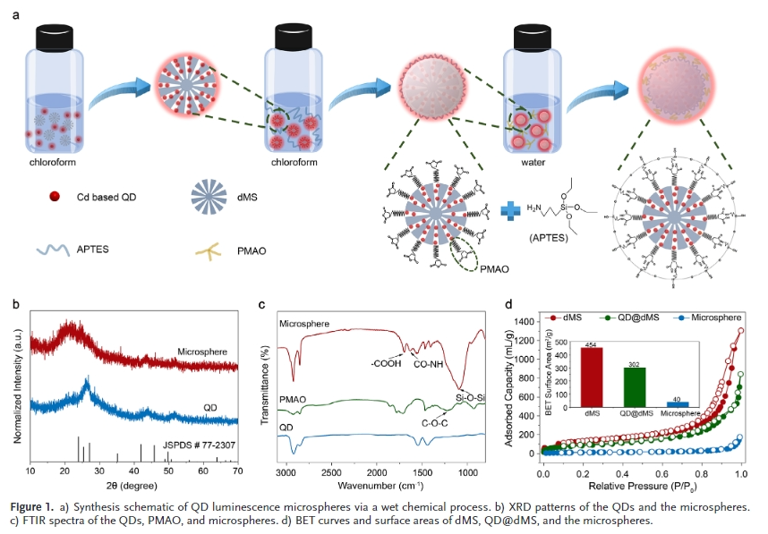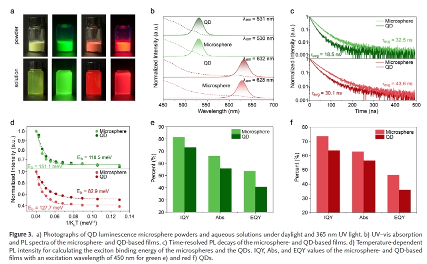 樹突狀介(jie)孔硅球(dms)具有(you)直徑可調、介(jie)孔豐富、高折射率、優異的(de)(de)(de)光(guang)學(xue)透過率和較強的(de)(de)(de)化(hua)學(xue)穩(wen)定(ding)性(xing)等特點。因此,將量(liang)子點封(feng)裝在dms的(de)(de)(de)介(jie)孔中,可以提高量(liang)子點的(de)(de)(de)顏色轉換性(xing)能(neng)和可靠(kao)性(xing)。介(jie)孔的(de)(de)(de)空間限制(zhi)作用降低了(le)量(liang)子點的(de)(de)(de)重吸收,使量(liang)子點與(yu)水和氧(yang)分離。此外,在介(jie)孔和填料之間形(xing)成的(de)(de)(de)光(guang)學(xue)微腔(qiang)改(gai)善了(le)激發光(guang)和發射光(guang)的(de)(de)(de)局部光(guang)場。然而,有(you)幾個關鍵問(wen)題需要解(jie)決,如:如何(he)在密封(feng)過程(cheng)中抑制(zhi)有(you)機(ji)配(pei)體脫落(luo)并減少對量(liang)子點表面的(de)(de)(de)損(sun)傷;封(feng)裝結構(gou)如何(he)影響顏色轉換性(xing)能(neng)。