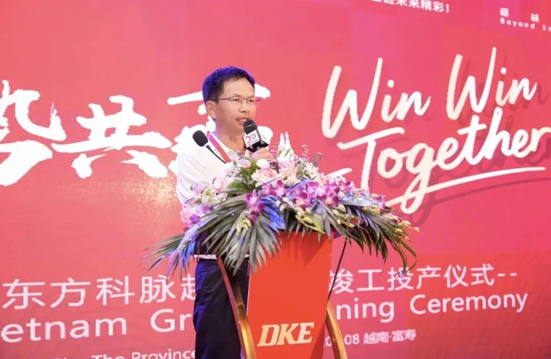隨后,越南富壽省工業管理局局長阮玉行祝賀并寄愿DKE東方科脈越南基地正式竣工投產。他表示,DKE越南基地作為該省工業發展規模較大的外商投資項目之一,始終嚴格遵守越南法規、積極履行環保責任、秉持可持續發展理念,樹立了優秀企業典范、充分展示了社會擔當,為富壽省發展作出重要貢獻,期待DKE越南基地創造更大價值,也相信其必將取得更大成功。