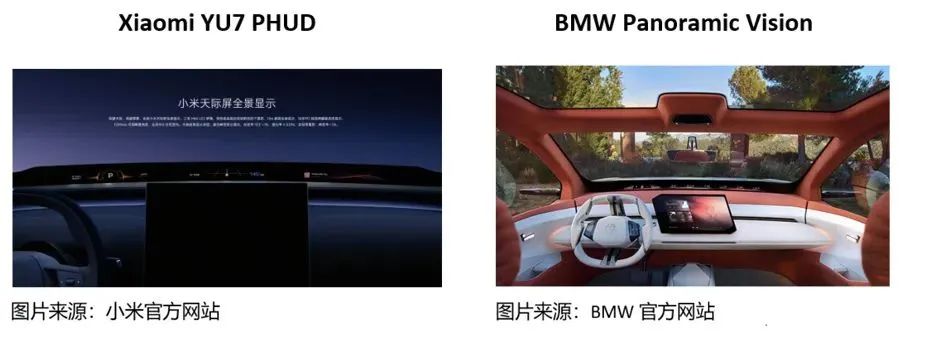 2025年5月小米YU7發布,首(shou)次實現了PHUD(Panoramic Head Up Display)全景(jing)抬頭顯示技術的量產,打破了傳統HUD的顯示邊界(jie),成為車載顯示PHUD技術發展的里程碑。該技術最早在2023年3月BMW首(shou)次推出(chu)的“BMW Panoramic Vision”概念上(shang)亮(liang)相,并預告將搭載于2026 年上(shang)市的Neue Klasse等新世代車型上(shang)。