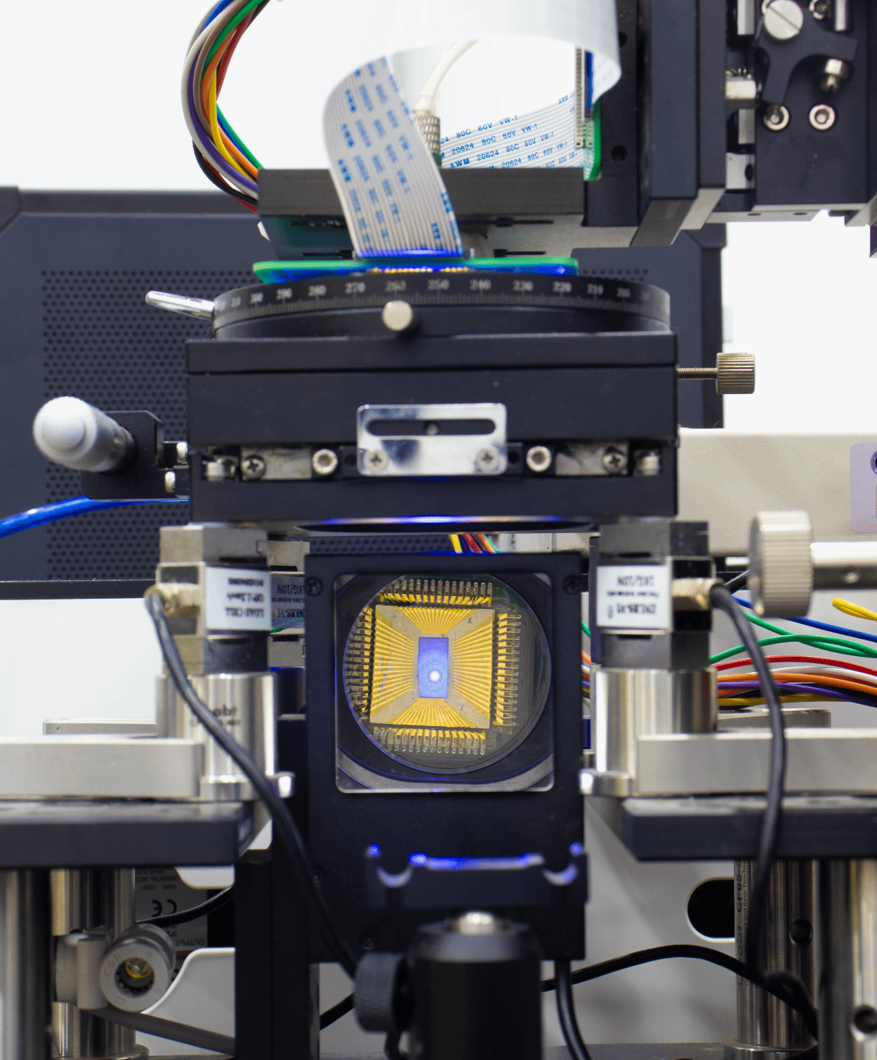圖為(wei)測試(shi)系(xi)統中(zhong)的(de)柔(rou)性探針,當(dang)探針接觸(chu)LED晶圓(yuan)后點亮其(qi)中(zhong)的(de)一個LED發(fa)出藍色(se)光,通過同軸光路可觀察(cha)光強和(he)波長(chang)信(xin)息。