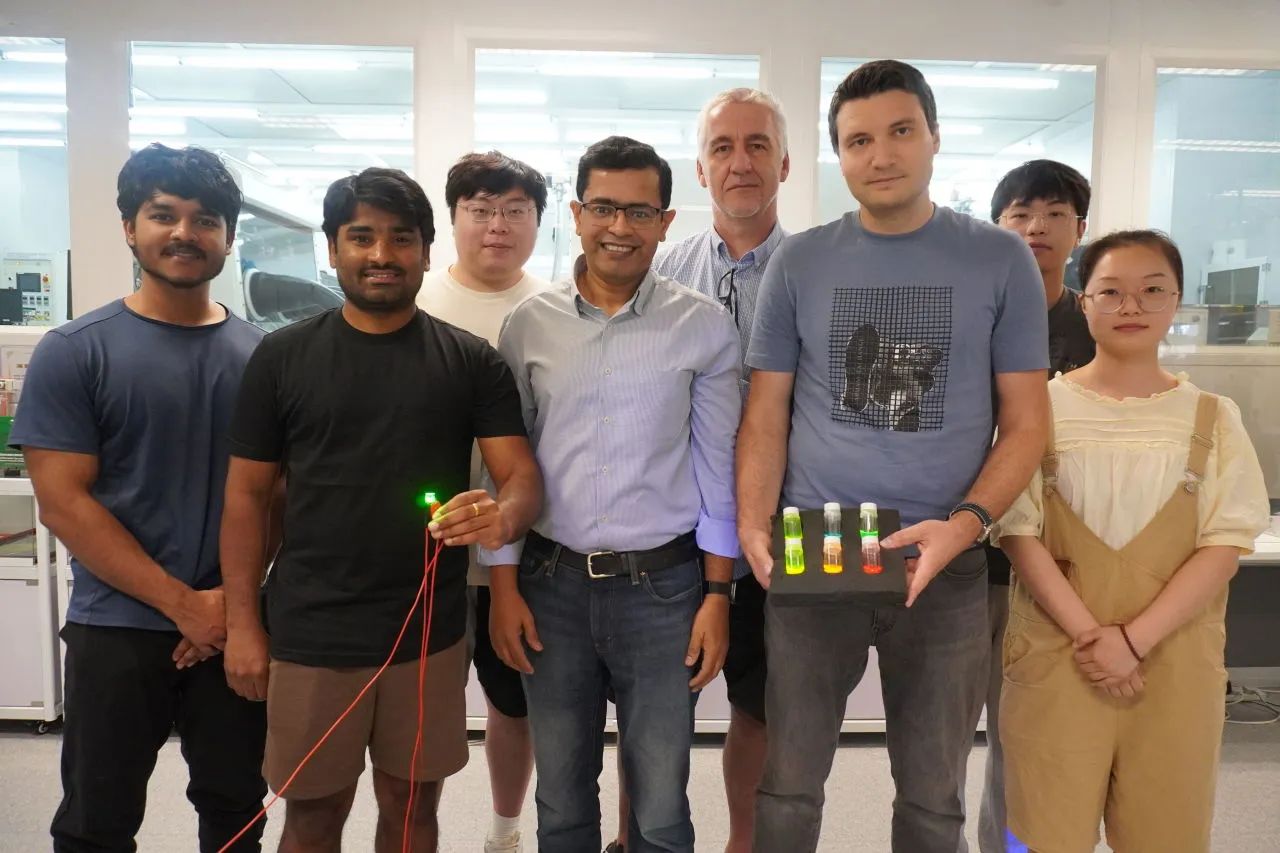 Abhishek K. SRIVASTAVA教授(前排中間(jian))、Maksym PRODANOV博士(前排右(you)二)和Kumar MALLEM(前排左二)與其(qi)研究團隊成員合影。Prodan博士手(shou)持(chi)的(de)三個瓶子內,載有量子棒材料。Mallem則手(shou)持(chi)綠(lv)色(se)發光(guang)QRLED樣本。