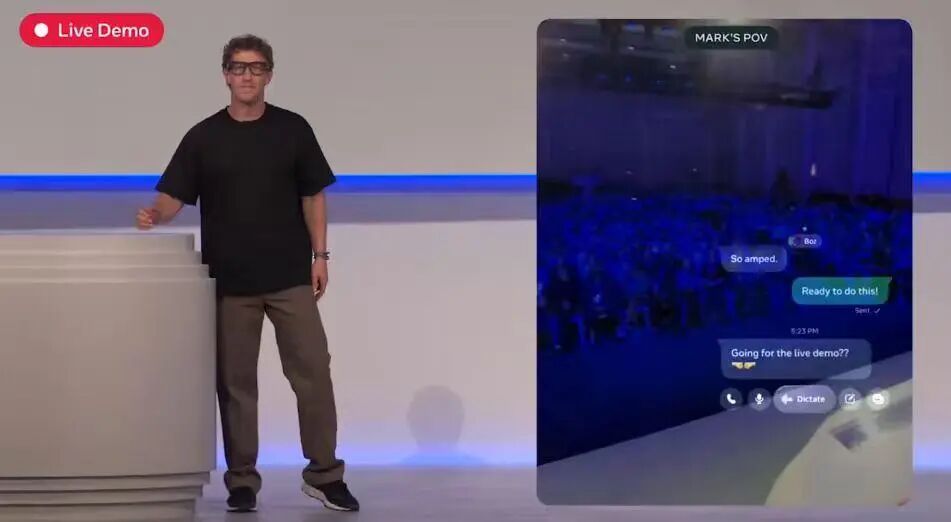 扎克伯格現場演示了Meta Ray-Ban Display眼鏡的手勢打字、視頻通話、音量調節、實時字幕等功能。但在視頻通話展示時出現狀況,扎克伯格試圖展示接聽Meta首席技術官Boz的視頻電話,但不知為何,他似乎無法接聽。