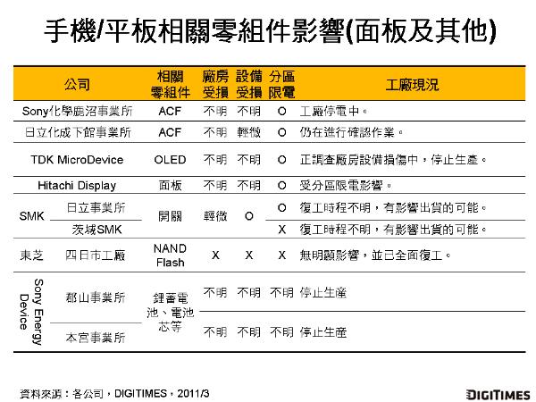在面板、開關、存儲器、電池芯、異方性導電膜(ACF)等手機/平板相關零組件方面,除東芝位于四日市生產NAND Flash的工廠未受到日本311地震沖擊,其余包含TDK、日立顯示、日立化成、SMK、Sony化學、Sony Energy Device等業者的生產工廠,分別受到廠房、設備受損或停止生產的大小不等的影響。